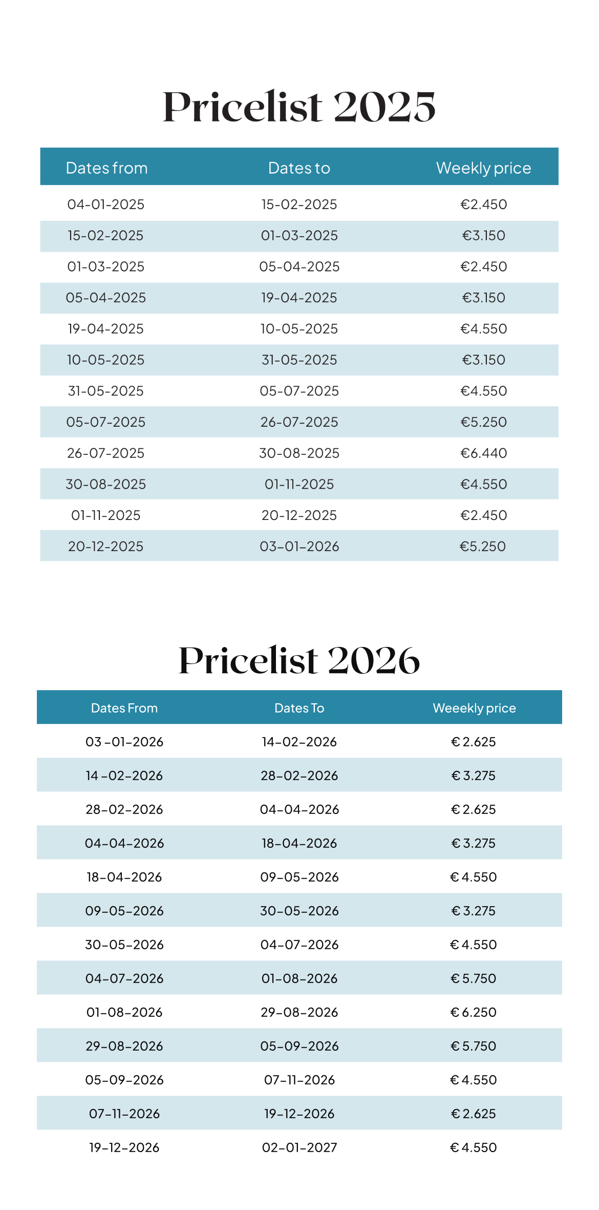 The total cost of your stay, including obligatory final cleaning, bed linen, towels and beach towels for all guests, is listed on the booking form. Costs for heating and air conditioning are usually included in the rental price, but if not, the cost will be calculated and shown on the booking form. Gas and electricity charges for normal use are also included, except for any optional energy charges listed on the booking form.